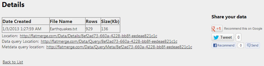 Here you will see your data details in FlatMerge. Listed are: date/time created (GMT), the original file name, number of rows, and storage space used. Since FlatMerge optimizes your data, the size (Kb) will be much less than the actual file size uploaded.